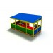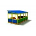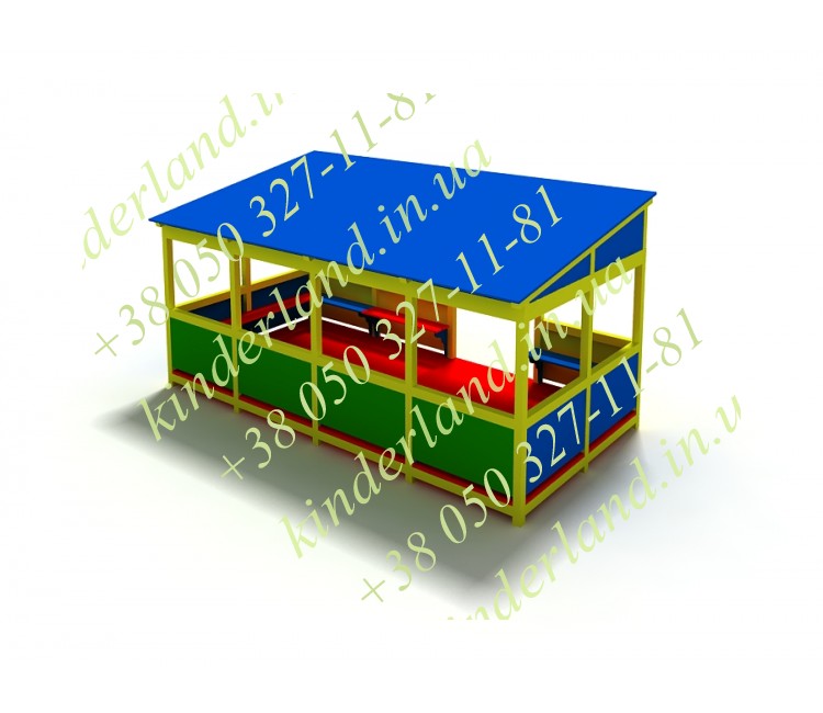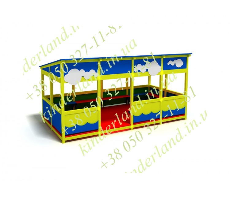 Летняя беседка оснащена лавками, покрытыми антисептиком. Сооружена с помощью качественных материалов, не склонных к появлению коррозии. Рассчитана на пользование детьми разных возрастных групп. Форма имеет вид павильона, декорированного белыми облачками. Внутри она также ярко окрашена, как и снаружи. «Облачко» покрашена в желтые, голубые, красные и белые цвета. Краски высококачественные, не выгорают на солнце, не портятся под воздействием воды.