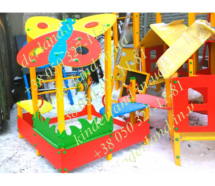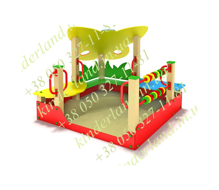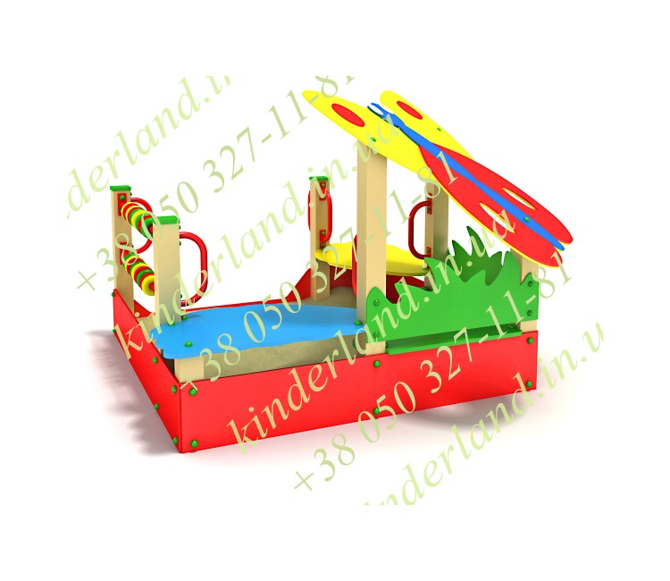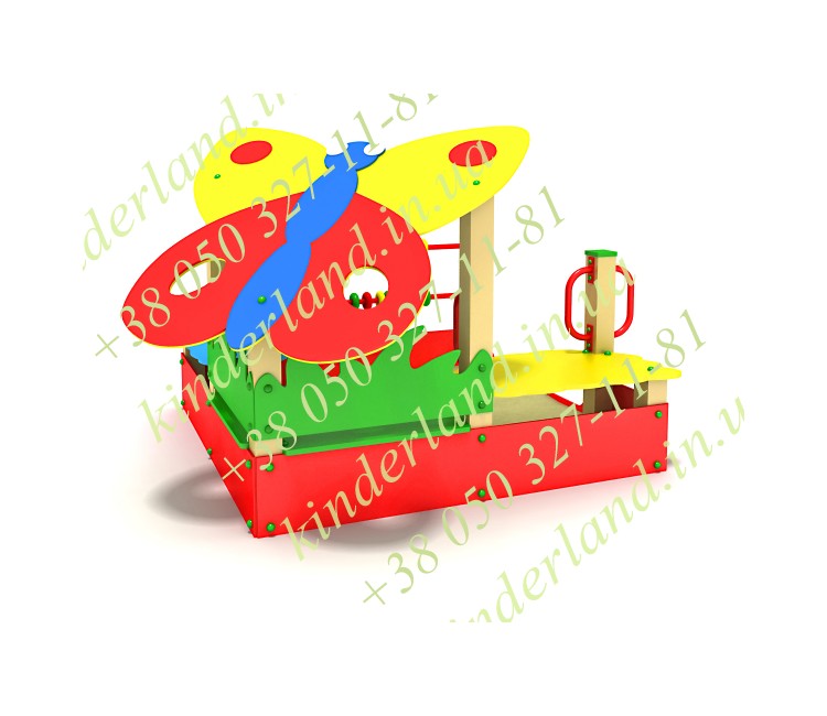 Декор сооружения будет радовать малышей, и гармонично впишется в целый уличный комплекс. Навес выполнен в виде бабочки, бортики имитируют траву, все элементы окрашены безопасными, но яркими красками. Последние стойко перенесут перепады температур, мелкие механические повреждения, осадки и солнечные лучи, не потеряв свой первоначальный внешний вид.