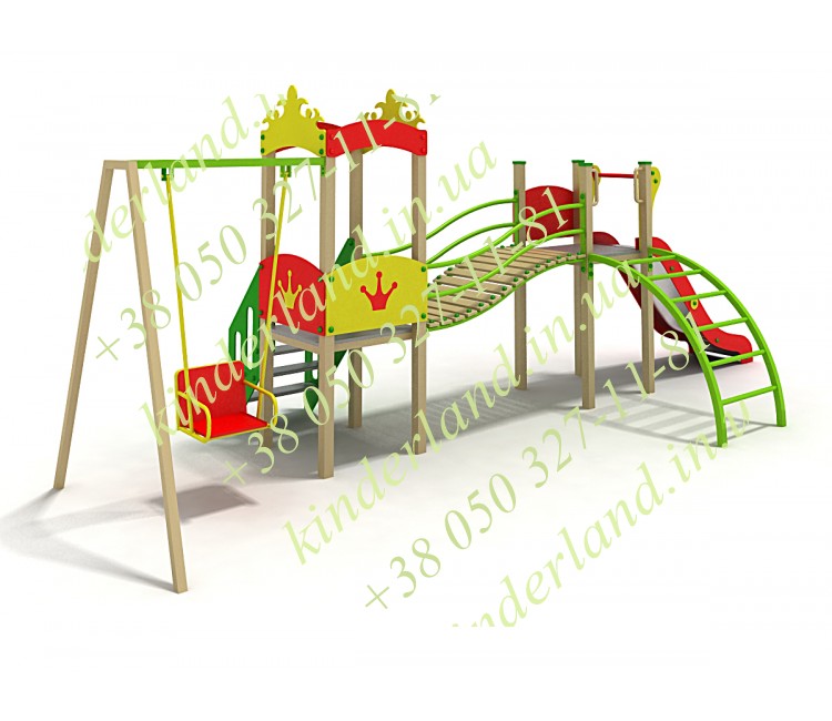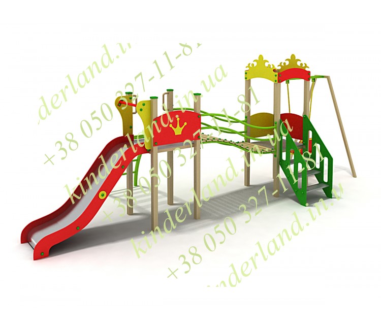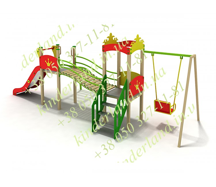 Теперь давайте рассмотрим подробно этот игровой комплекс. Здесь есть, во-первых, две башенки с разноуровневыми площадками. От одной спускается крутая горка, рядом со второй находятся одноместные качели, в которые так и хочется умоститься и воспарить ввысь! Дополняют комплект разнокалиберные лестницы, а также изогнутый дощатый переход с необычными перилами.