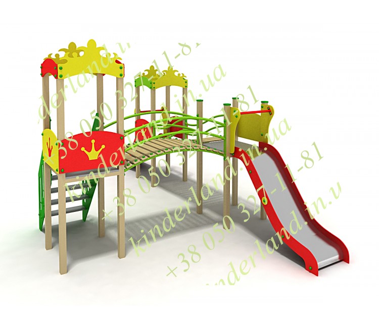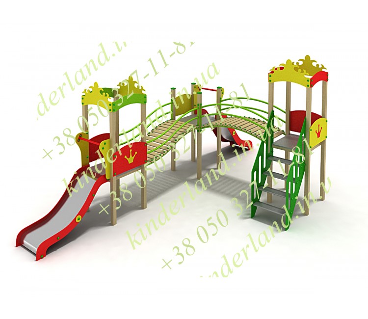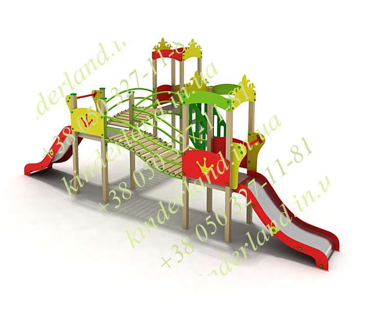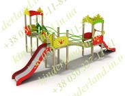 Этот комплекс при желании уже можно назвать маленьким игровым городком. Здесь есть разноуровневые башенки и площадки, всевозможные мостики, лесенки и преходы – а самое главное – сразу две горки! Они имеют различную высоту (70 см и ровно метр), и детишки смогут кататься с них одновременно. Вообще, сюда можно без риска запустить даже целую ораву ребятишек, и им не будет тесно – еще бы, ведь пытливые детишки будут безостановочно исследовать все уголки игровой конструкции. И, надо сказать, тут есть на что посмотреть!