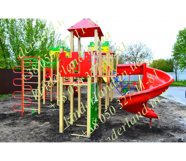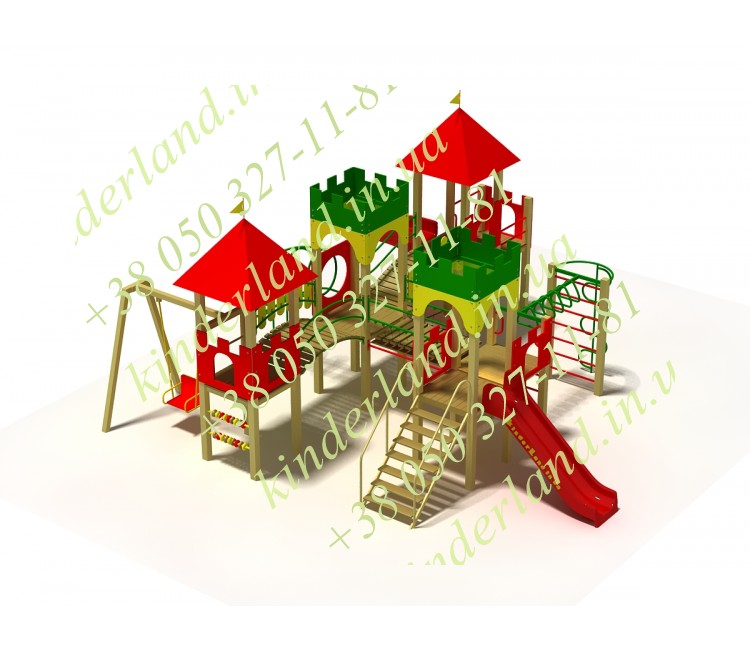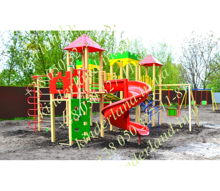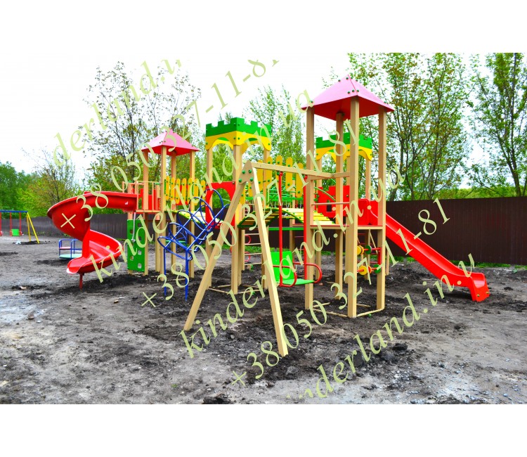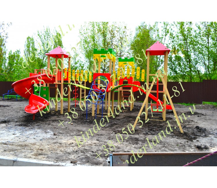«Замок» - один из наиболее привлекательных и многофункциональных комплексов, созданный нашей компанией. Его главное достоинство – винтовая детская горка. Также, комплектация комплекса предусматривает наличие качели, турников, лазов, навесных переходов, крепостей.