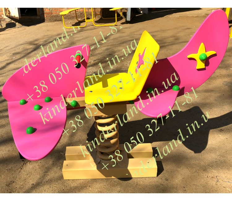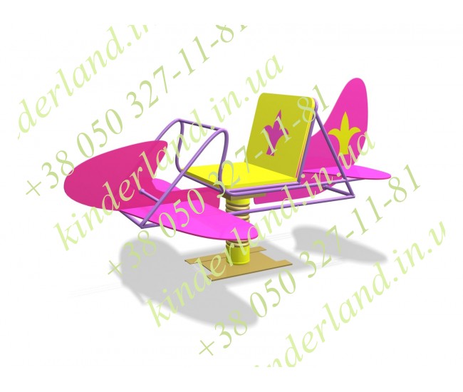 Компания «KinderLand» рекомендует купить «САМОЛЕТ БАРБИ» с кодом 216. Представленная качалка на пружине самолет имеет форму реального аэроплана, её прочное металлическое основание, впоследствии бетонируют в грунт. Конструкция качели закреплена на толстой пружине соединяющейся снизу с основанием.